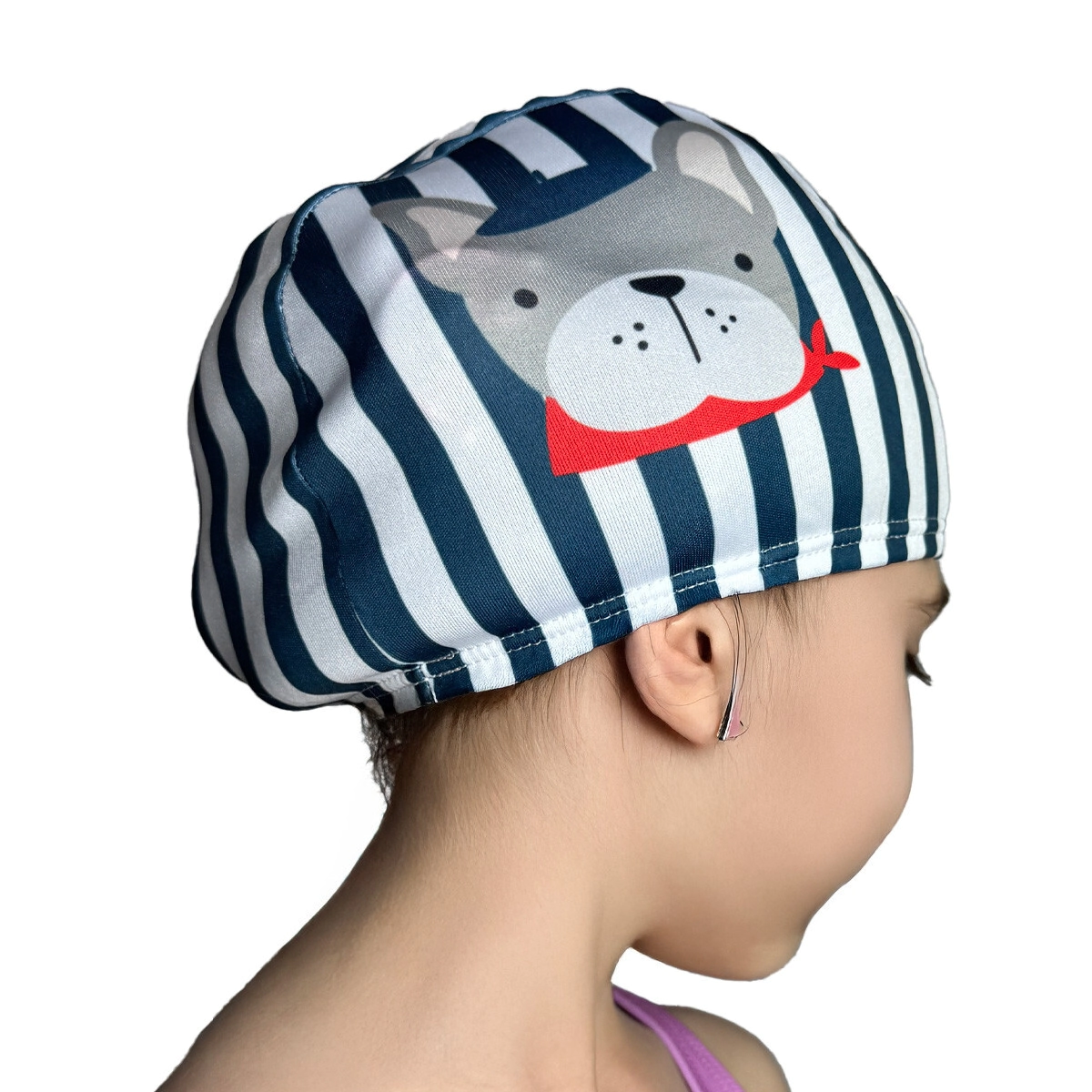 Con un diseño divertido de bulldog con rayas marineras, motiva a los más pequeños a disfrutar cada momento en la pileta con estilo y protección.
